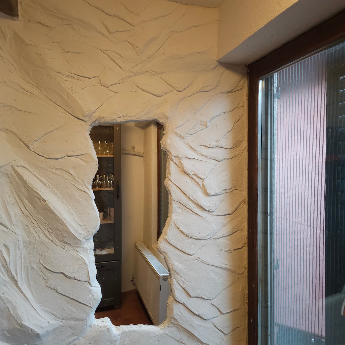 Dekorativni 3D zid sa imitacijom prirodne stene i integrisanim ogledalom – prostor dobija karakter i postaje omiljeno mesto za fotografiju pre izlaska.
